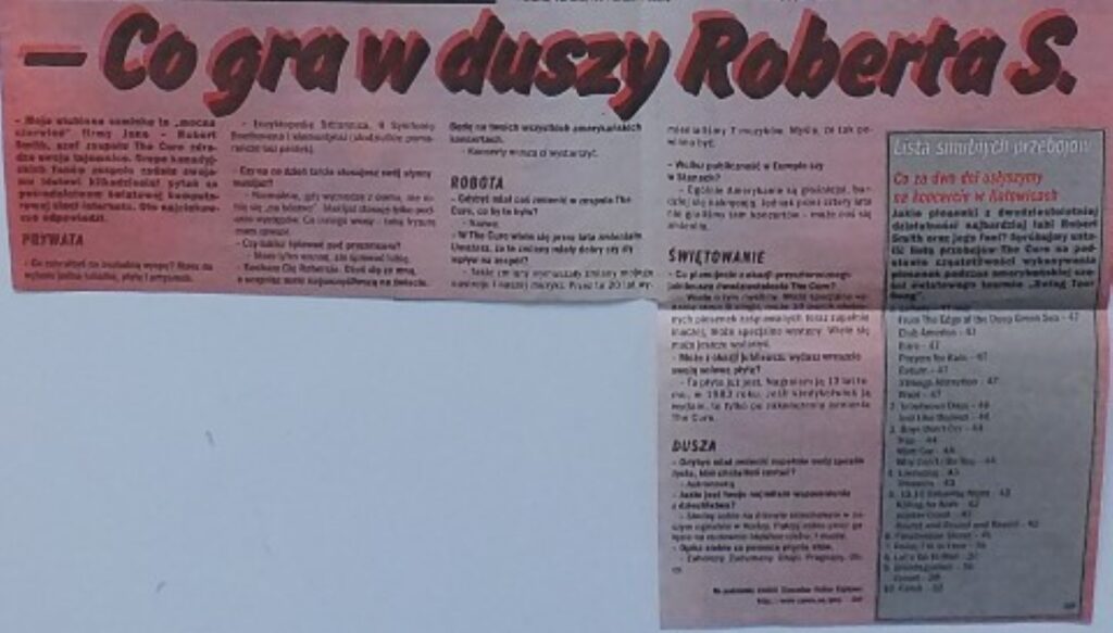 (Artykuł z 1996 roku) Moja ulubiona szminka to ,,mocna czerwień’ firmy Jane – Robert Smith, szef zespołu The Cure zdradza swoje tajemnice. Grupa kanadyjskich fanów zespołu zadala swojemu idolowi kilkadziesiąt pytań za posrednictwem światowej komputerowej sieci Internetu. Oto najciekawsze odpowiedzi: