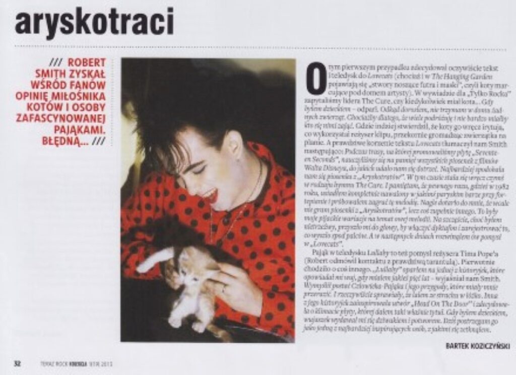 O tym pierwszym przypadku zdecydował oczywiście tekst i teledysk do Lovecats (chociaż i w The Hanging Garden pojawiają się „stwory noszące futra i maski”, czyli koty marcujące pod domem artysty). W wywiadzie dla „Tylko Rocka” zapytaliśmy lidera The Cure, czy kiedykolwiek miał kota… Gdy byłem dzieckiem – odparł. Odkąd dorosłem, nie trzymam w domu żadnych zwierząt. Chociażby dlatego, że wiele podróżuję i nie bardzo mialby kto się nimi zająć. Gdzie indziej stwierdził, że koty go wręcz irytują, co wykorzystał reżyser klipu, przekornie gromadząc zwierzątka na planie.